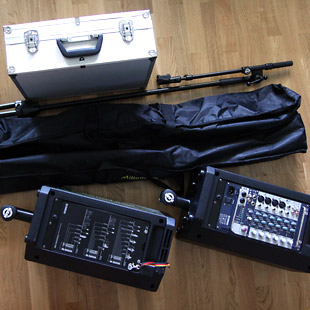 Subwoofer, mikseri, monitori, fiinimmät kaiutintelineet, DI-boksit, kaapelit sekä testaus- ja mittauslaitteet